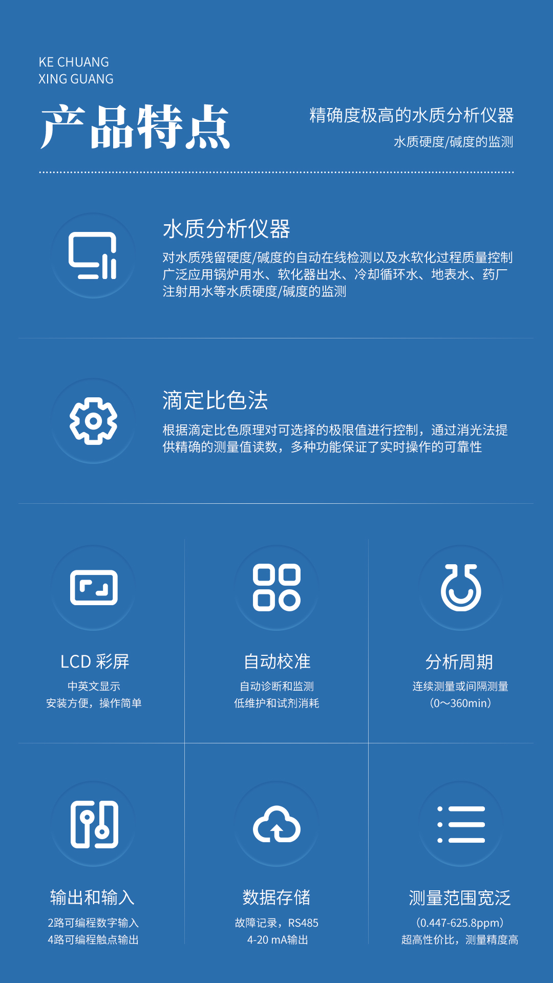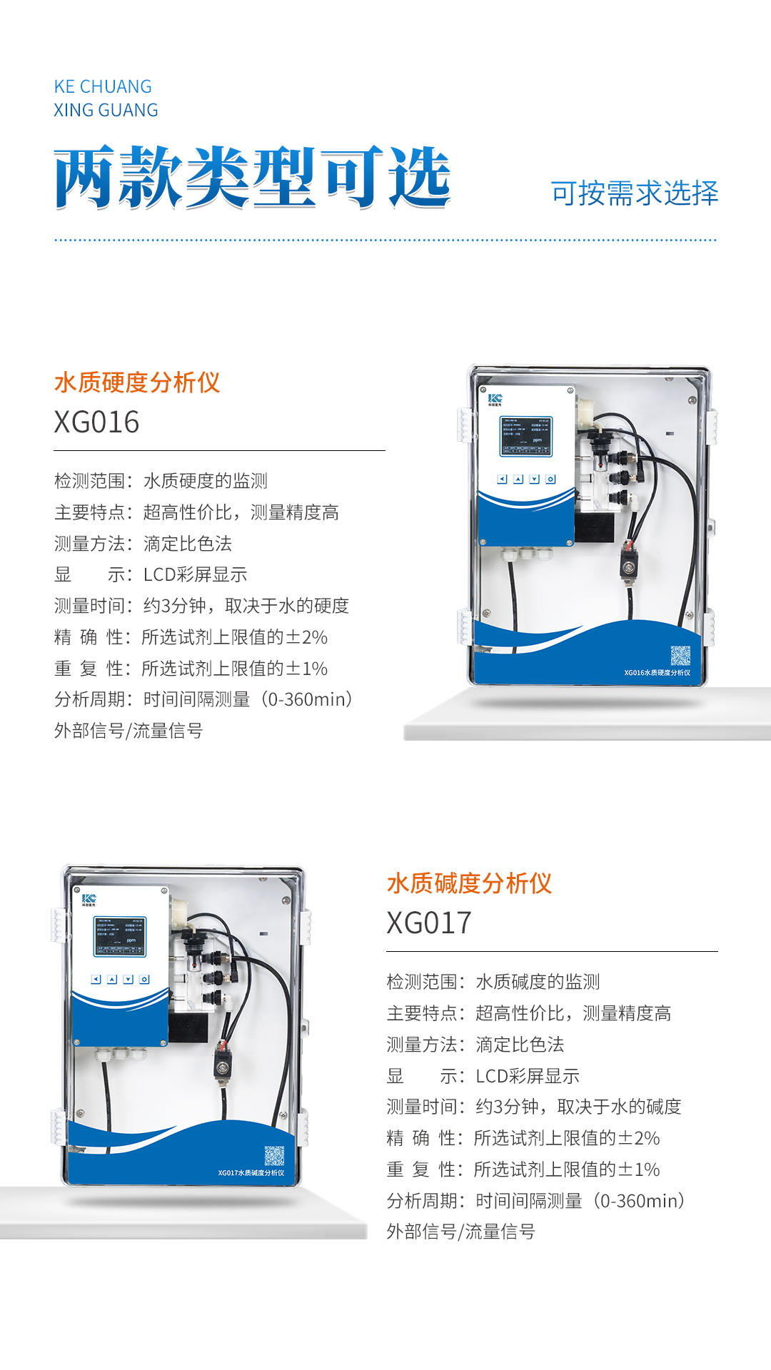 XG016型 水质硬度分析仪 是一款结构紧凑、易于操作且精确度极高的水质分析仪器,用于对水质残留硬度的自动在线检测以及水软化过程的质量控制。水质硬度分析仪根据滴定比色原理对可选择的极限值进行控制,通过消光法提供精确的测量值读数,多种功能保证了实时操作的可靠性。低维护和低试剂消耗,可长时间连续运行,基本免维护,特别适用于循环冷却水、锅炉用水等软化水水质硬度的检测和控制,并可搭配多通道分配器轻松实现2-8通道不停机自动测量。可广泛应用于锅炉用水、软化器出水、冷却循环水、地表水、药厂注射用水等水质硬度的监测。