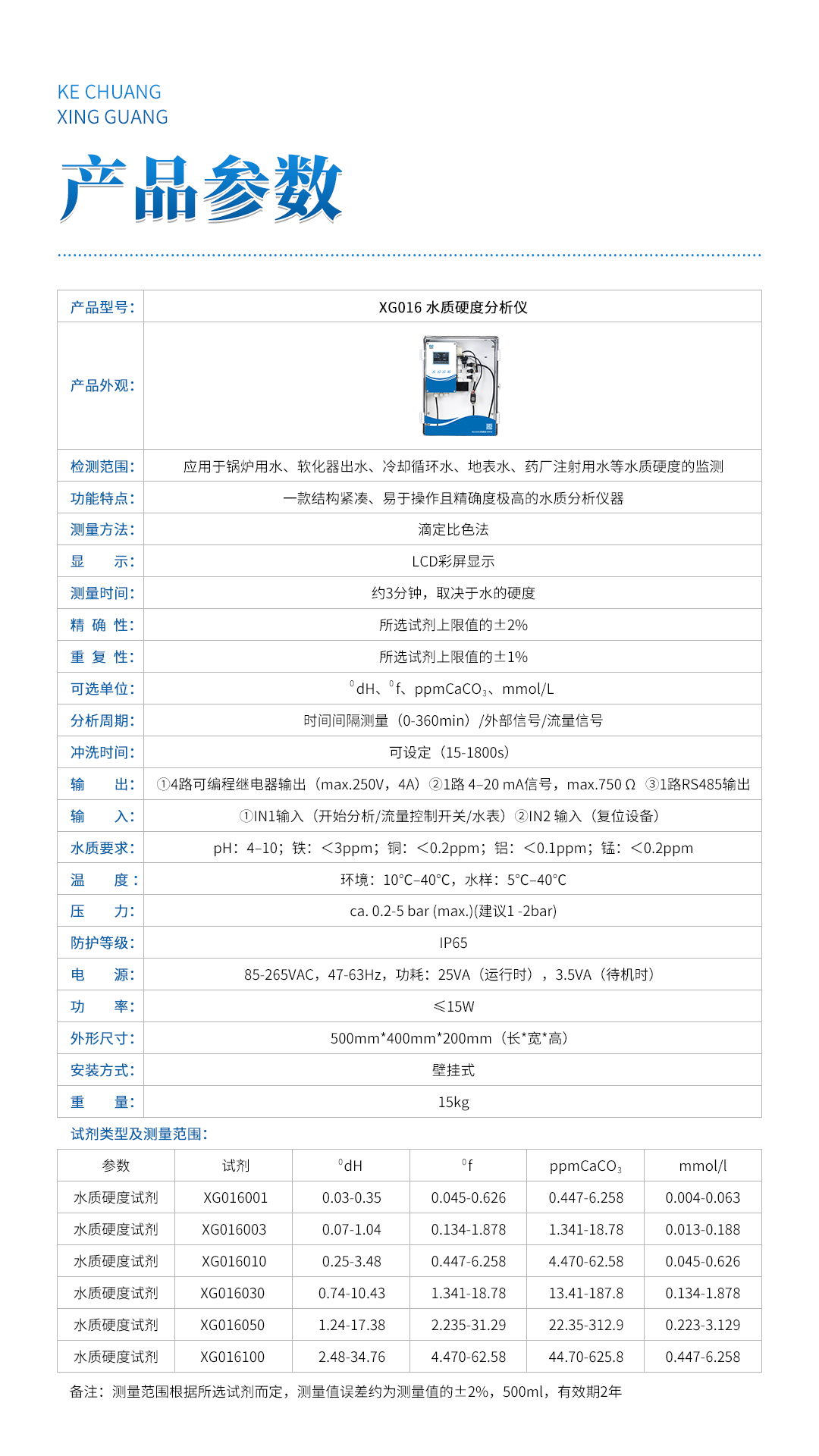 | 水质硬度试剂 | XG016050 | 1.24-17.38 | 2.235-31.29 | 22.35-312.9 | 0.223-3.129 |