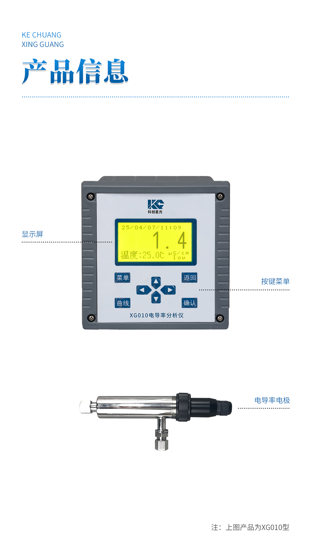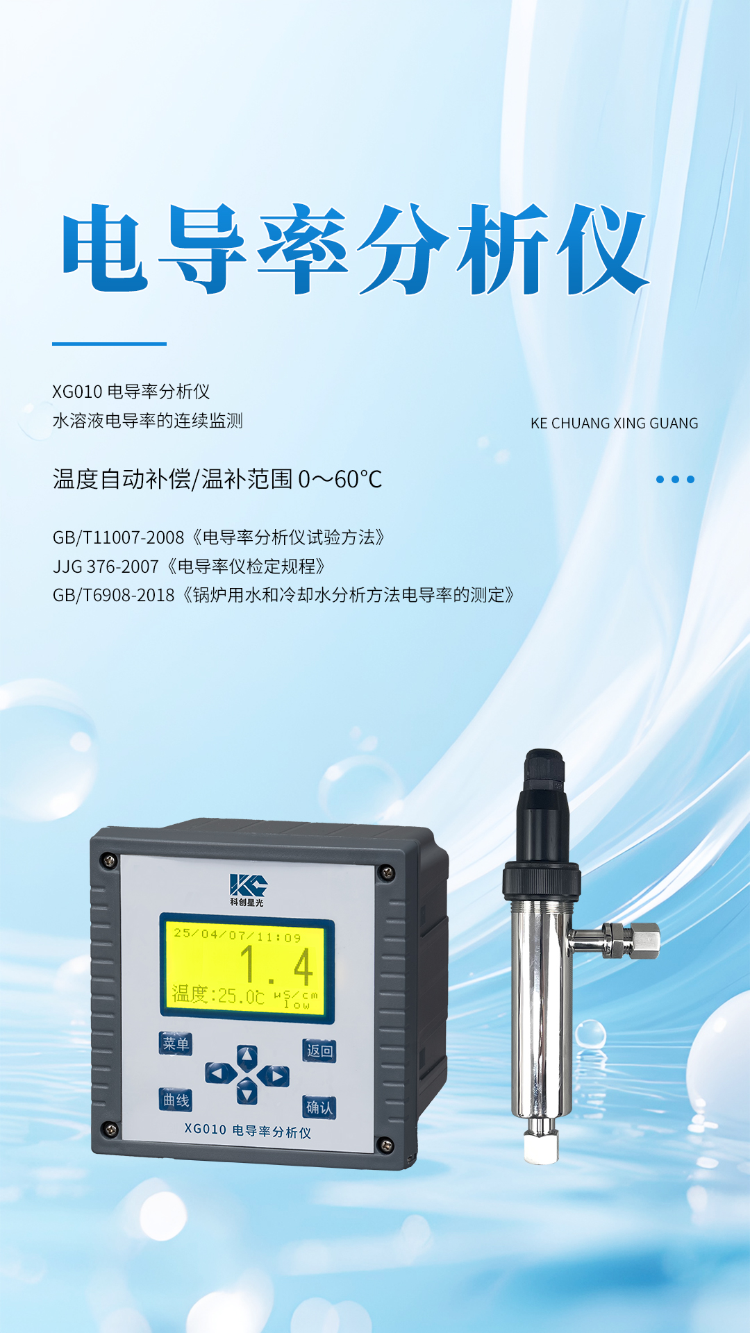 XG010型 电导率分析仪是我公司新一代高智能型水质在线电导率分析仪,全套仪表由电导电极、测量流通池和电子单元组成,依据GB/T11007《电导率分析仪试验方法》和JJG 376《电导率仪检定规程》标准设计制造,适用于GB/T6908《锅炉用水和冷却水分析方法电导率的测定》,可广泛应用于电力、化工、冶金、环保、制药、半导体和自来水等行业水溶液电导率的连续监测。