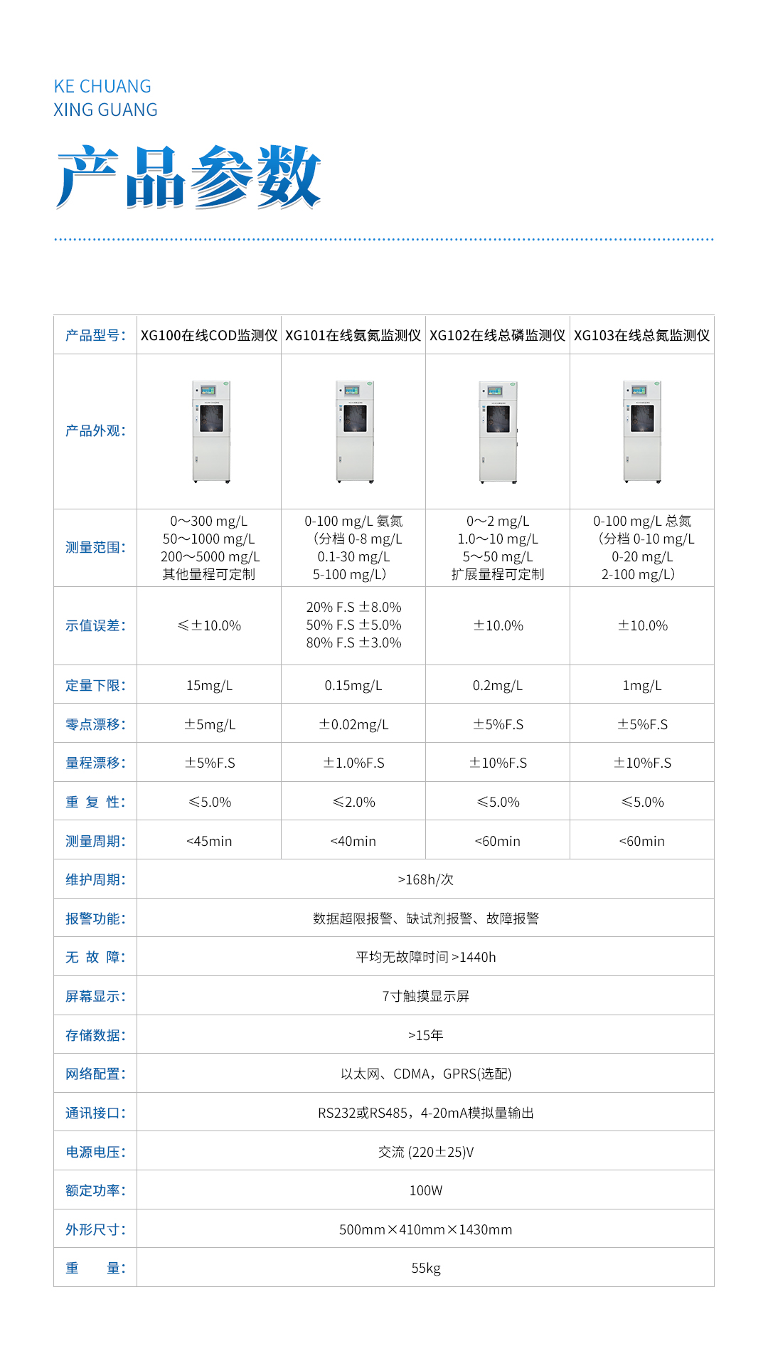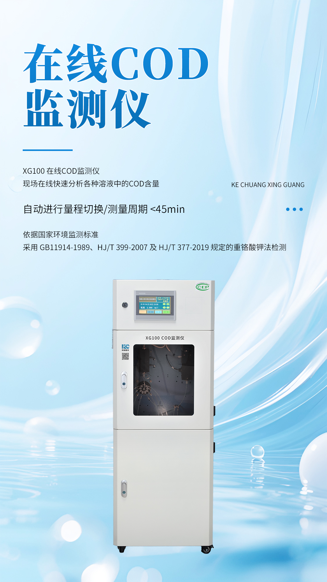XG100 COD监测仪 依据国家环境监测标准,采用GB11914、HJ/T399及HJ/T377规定的重铬酸钾法检测,选用先进精确的定量装置,高性能十通路阀,功能强大稳定的PLC控制器和自主研制的光度监测仪器,通过光电比色,计算机软件计算水样中COD浓度实现全自动一体化,广泛应用于现场在线快速分析江河湖泊水体、自来水、排放废水、高浓度污水及各种溶液中的COD含量。