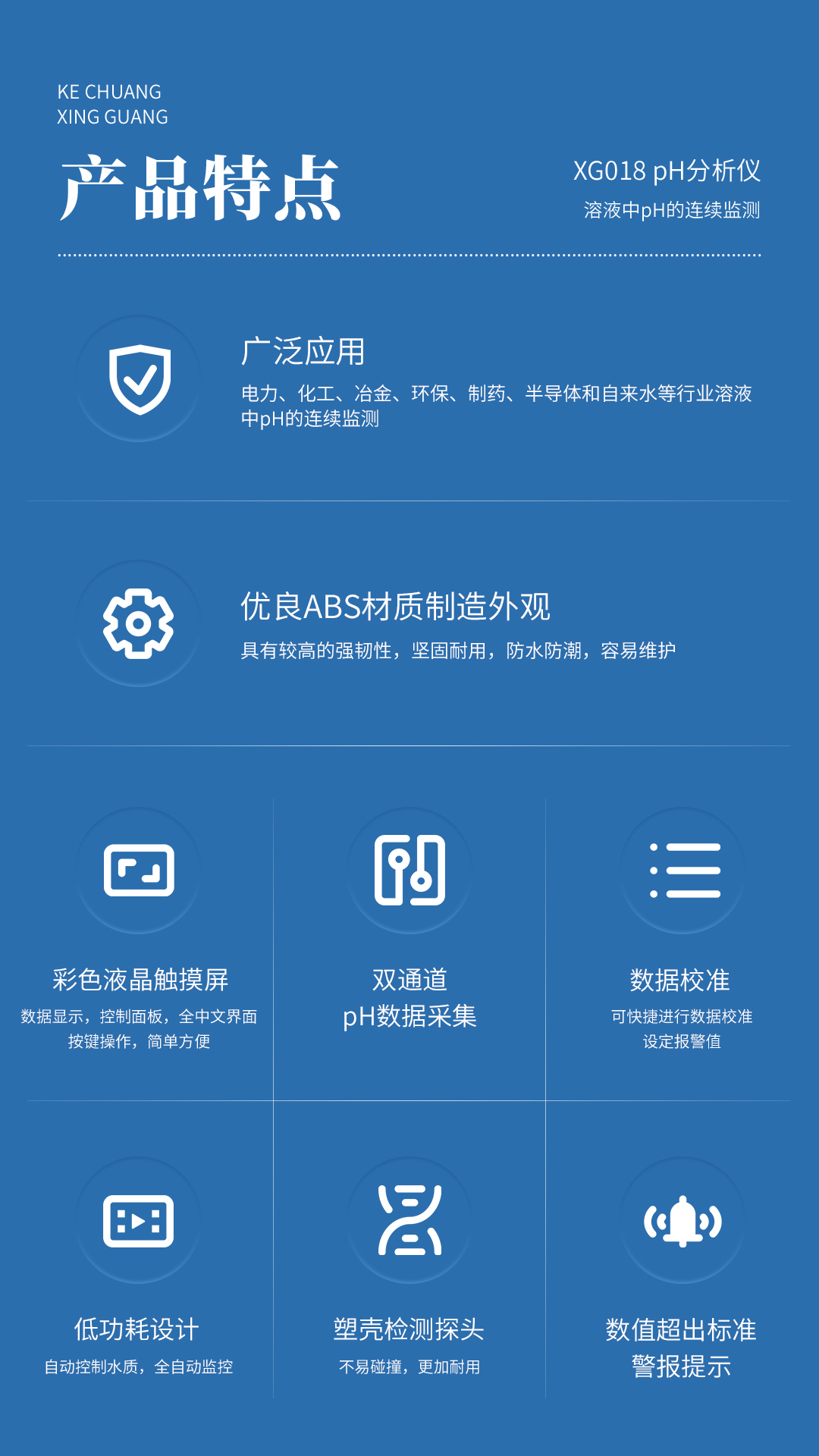 XG018 PH分析仪(双通道)) 广泛应用于电力、化工、冶金、环保水处理工程、制药、生化、食品、养殖和自来水等溶液中PH的连续监测。