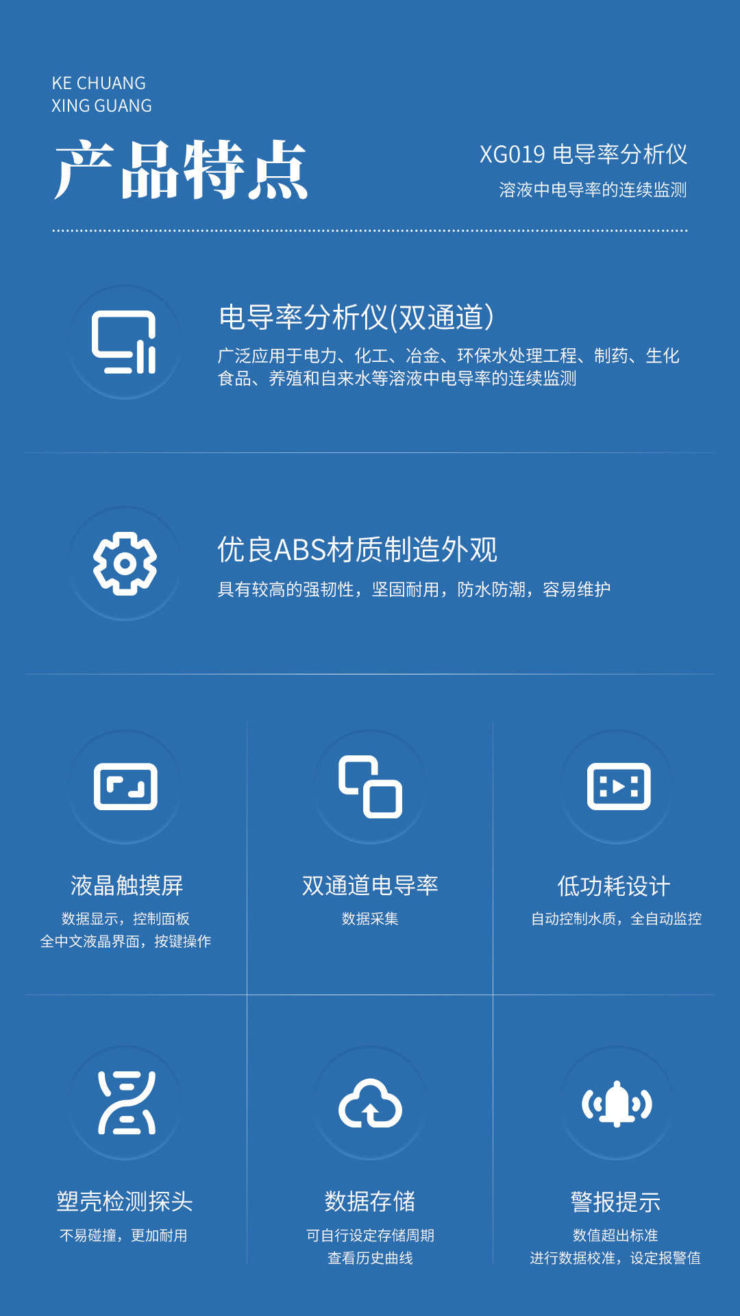 XG019 电导率分析仪(双通道) 广泛应用于电力、化工、冶金、环保水处理工程、制药、生化、食品、养殖和自来水等溶液中电导率的连续监测。