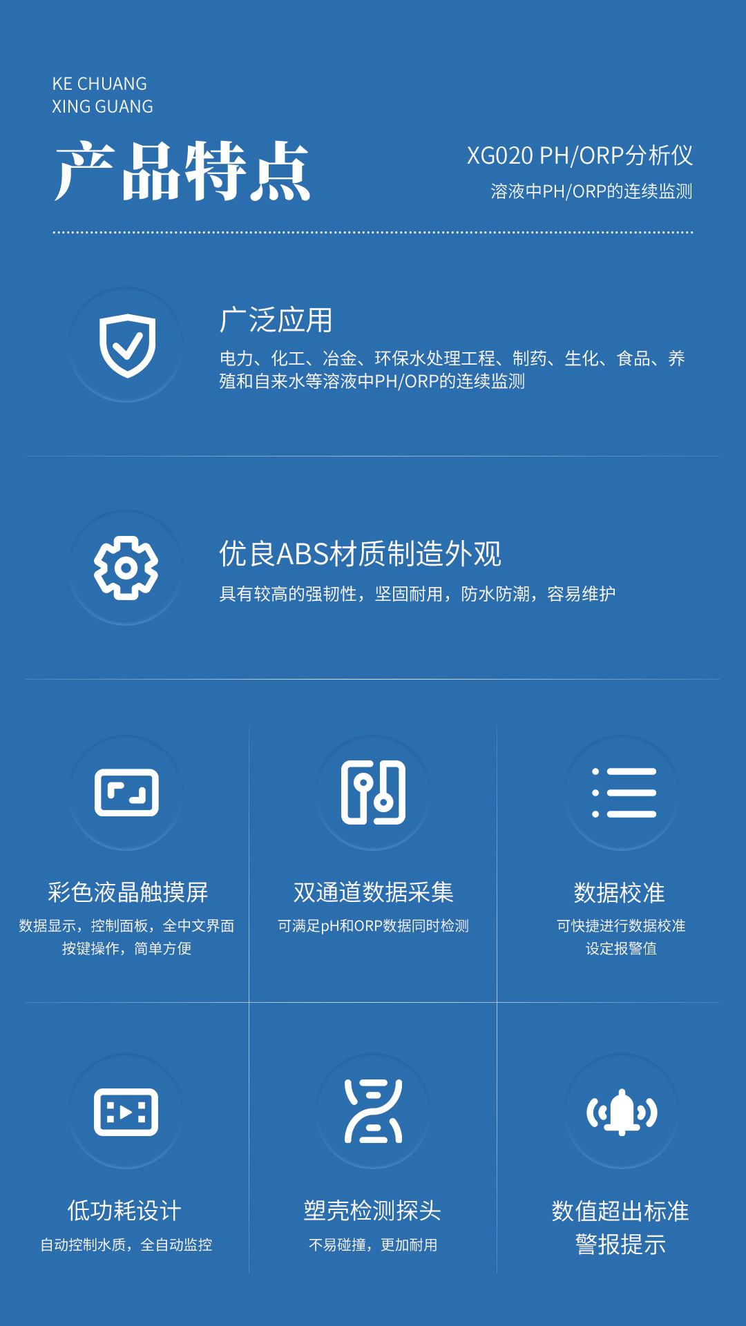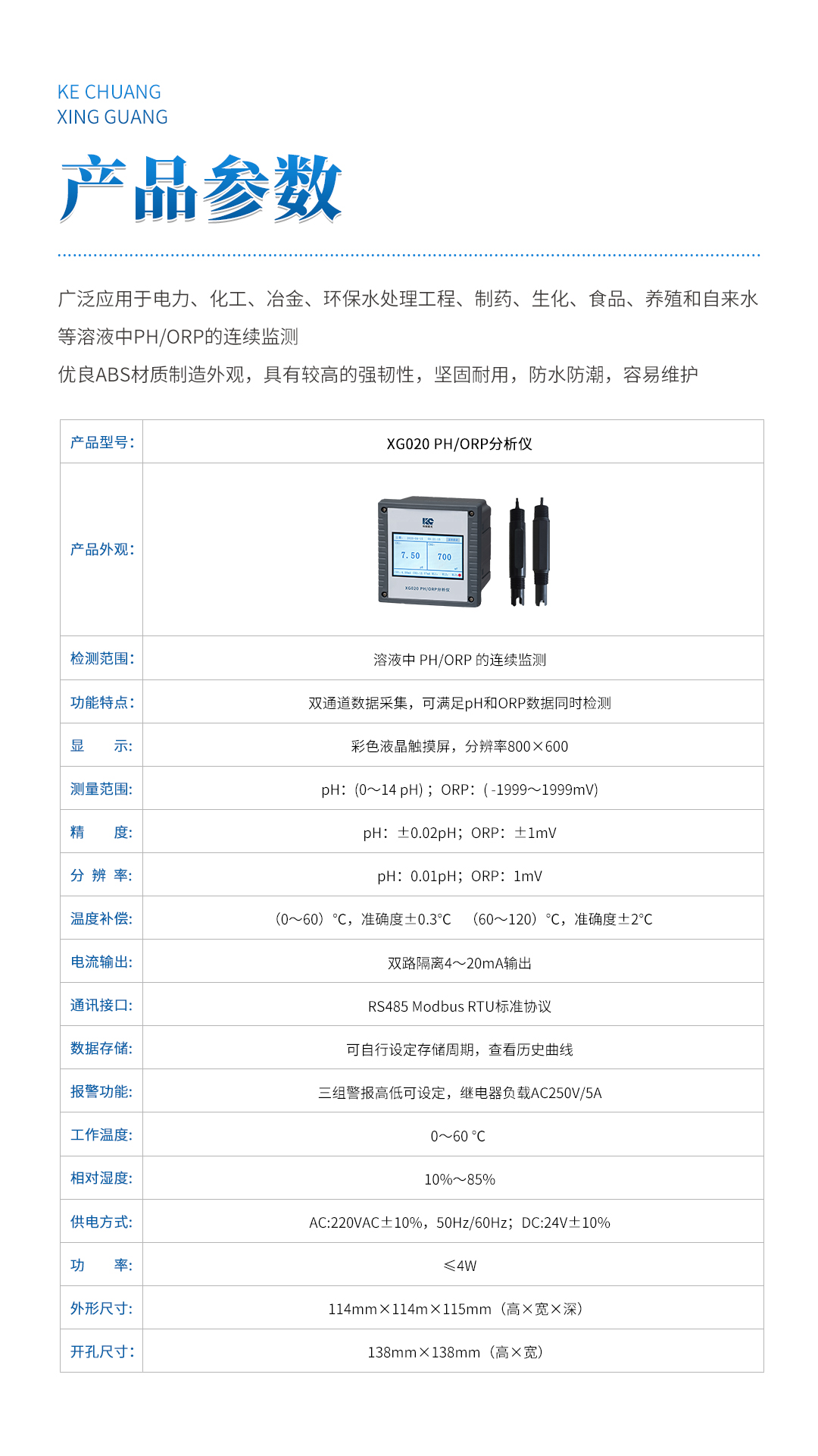 XG020 PH/ORP分析仪 广泛应用于电力、化工、冶金、环保水处理工程、制药、生化、食品、养殖和自来水等溶液中PH/ORP的连续监测。