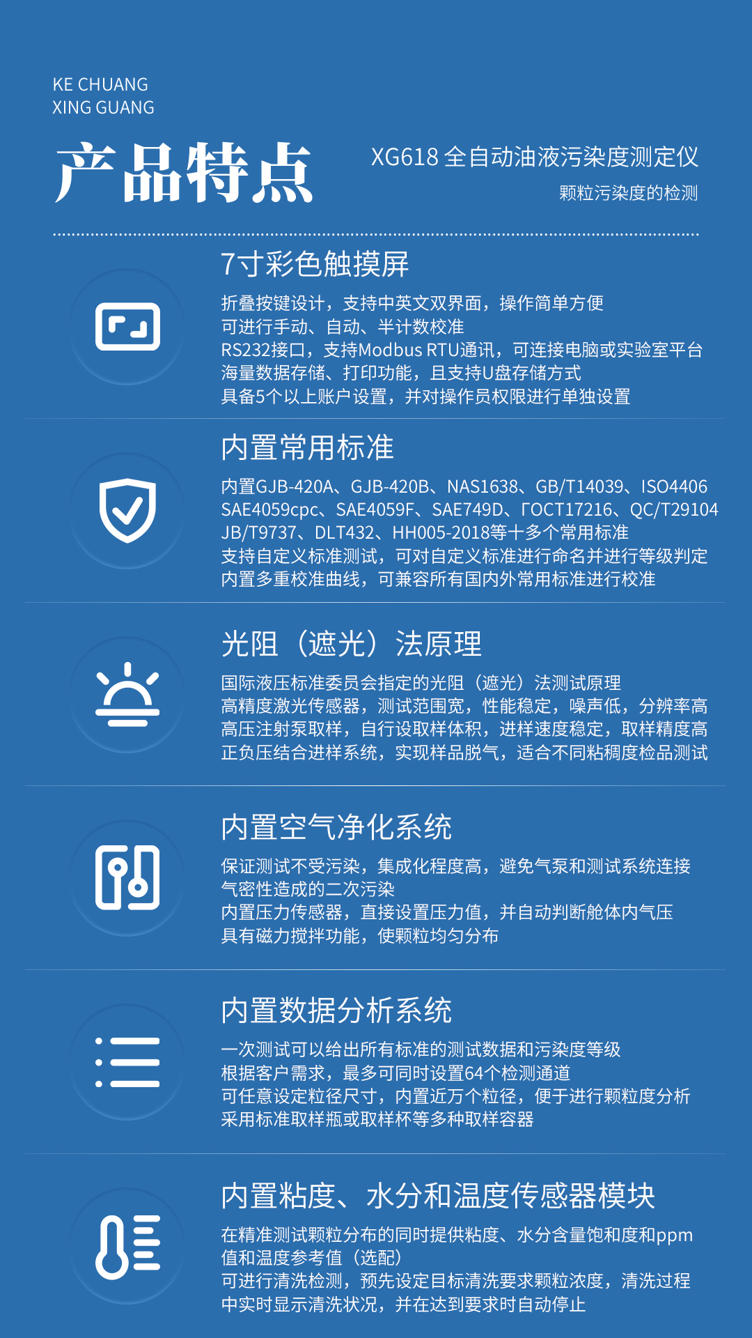 XG618 全自动油液污染度测定仪(油液颗粒度测定仪) 符合GB/T 18854-2002(ISO11171-1999)等标准。采用光阻(遮光)法计数原理研制,完全符合相应国家标准及国际标准。可提供快速、准确、可靠、可重复的检测结果及完整的污染监测分析报告,适用于液压油、润滑油、抗燃油、绝缘油和透平油等颗粒污染度的检测。可广泛应用于航空、航天、电力、石油、化工、交通、港口、冶金、机械、汽车制造等领域。