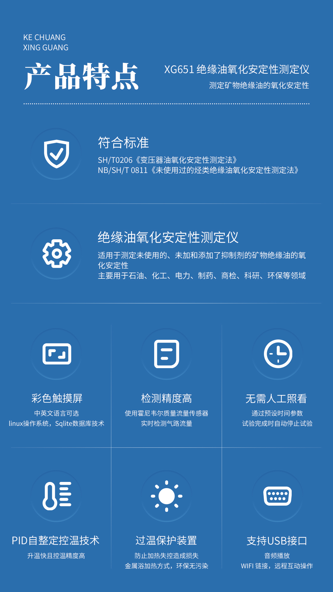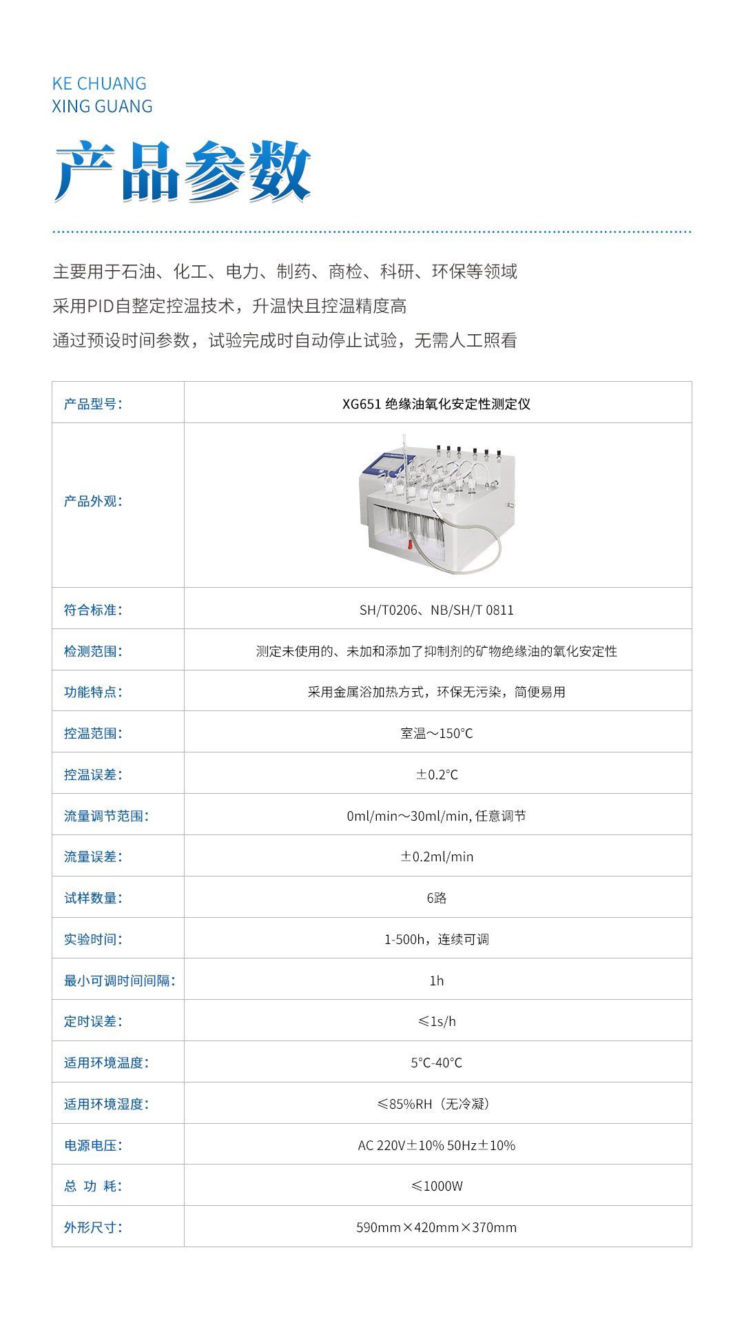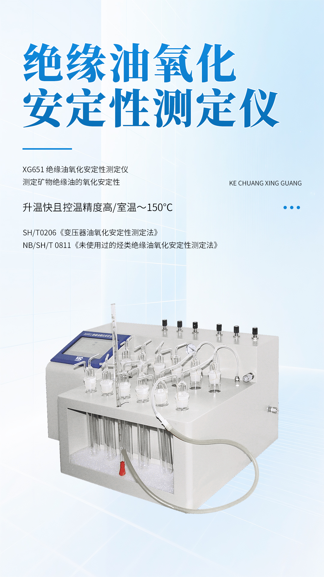 XG651 绝缘油氧化安定性测定仪 根据SH/T0206、NB/SH/T 0811《未使用过的烃类绝缘油氧化安定性测定法》标准设计、制造。本仪器适用于测定未使用的、未加和添加了抑制剂的矿物绝缘油的氧化安定性。主要用于石油、化工、电力、制药、商检、科研、环保等领域。