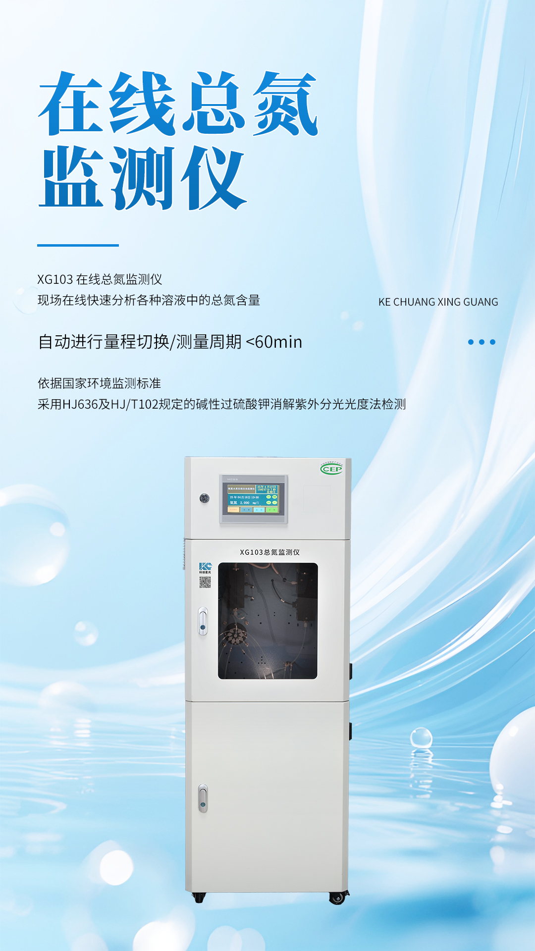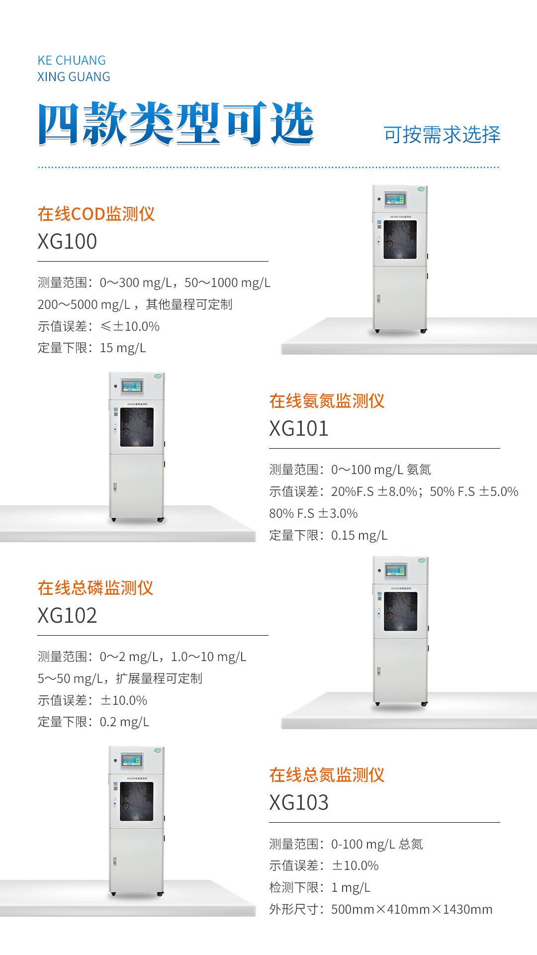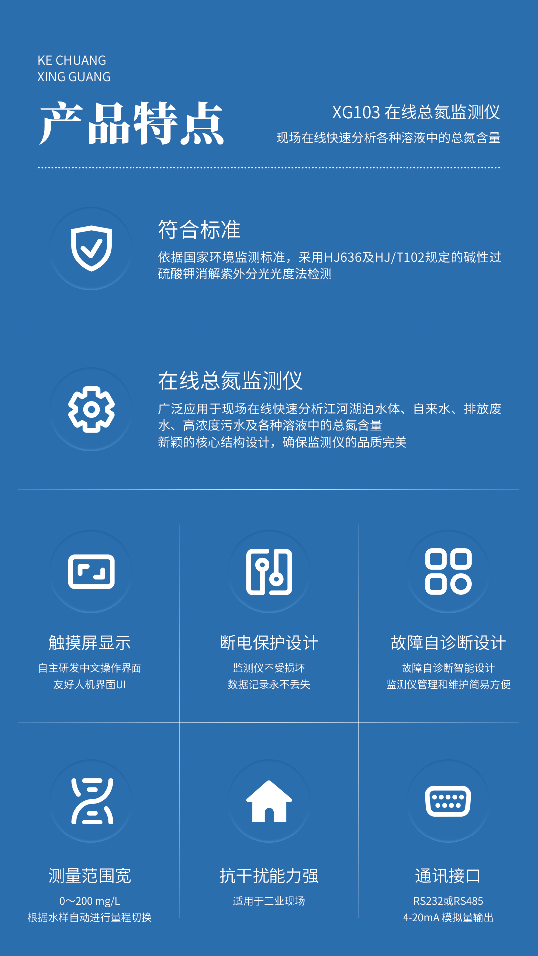 XG103 在线总氮监测仪 依据国家环境监测标准,HJ636及HJ/T102规定的碱性过硫酸钾消解紫外分光光度法检测,选用先进精确的定量装置,高性能十通路阀,功能强大稳定的PLC控制器和自主研制的光度监测仪器,通过光电比色,计算机软件计算水样中总氮浓度实现全自动一体化,广泛应用于现场在线快速分析江河湖泊水体、自来水、排放废水、高浓度污水及各种溶液中的总氮含量。