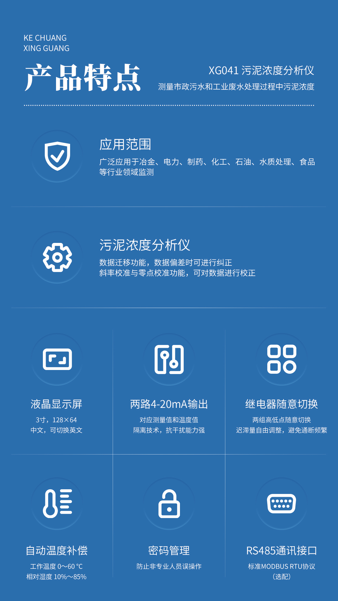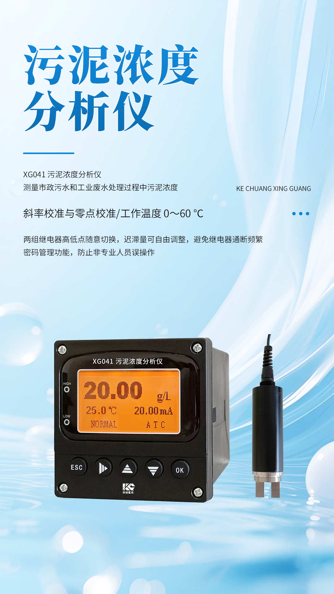 XG041 污泥浓度分析仪 是专为测量市政污水和工业废水处理过程中污泥浓度而设计的在线监测仪表,污泥浓度传感器的原理基于组合红外吸收散射光线法,应用ISO7027 方法可以连续并精确测定污泥浓度,广泛应用于冶金、电力、制药、化工、石油、水质处理、食品等行业领域监测。