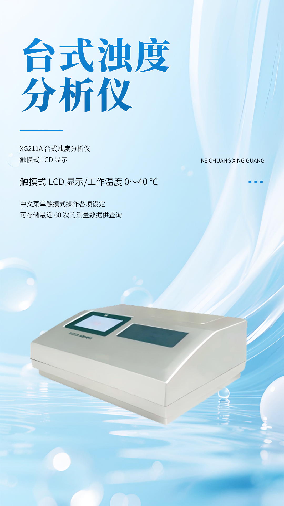 XG211A型 台式浊度分析仪 采用了微电脑监控测试技术,触摸式 LCD 显示,中文菜单触摸式操作各项设定;仪器可存储最近 60 次的测量数据供查询。升级换代后的浊度仪,操作更加方便,工作更加稳定,测量数据更加精确;浊度仪各项技术指标已达到国际同类产品。