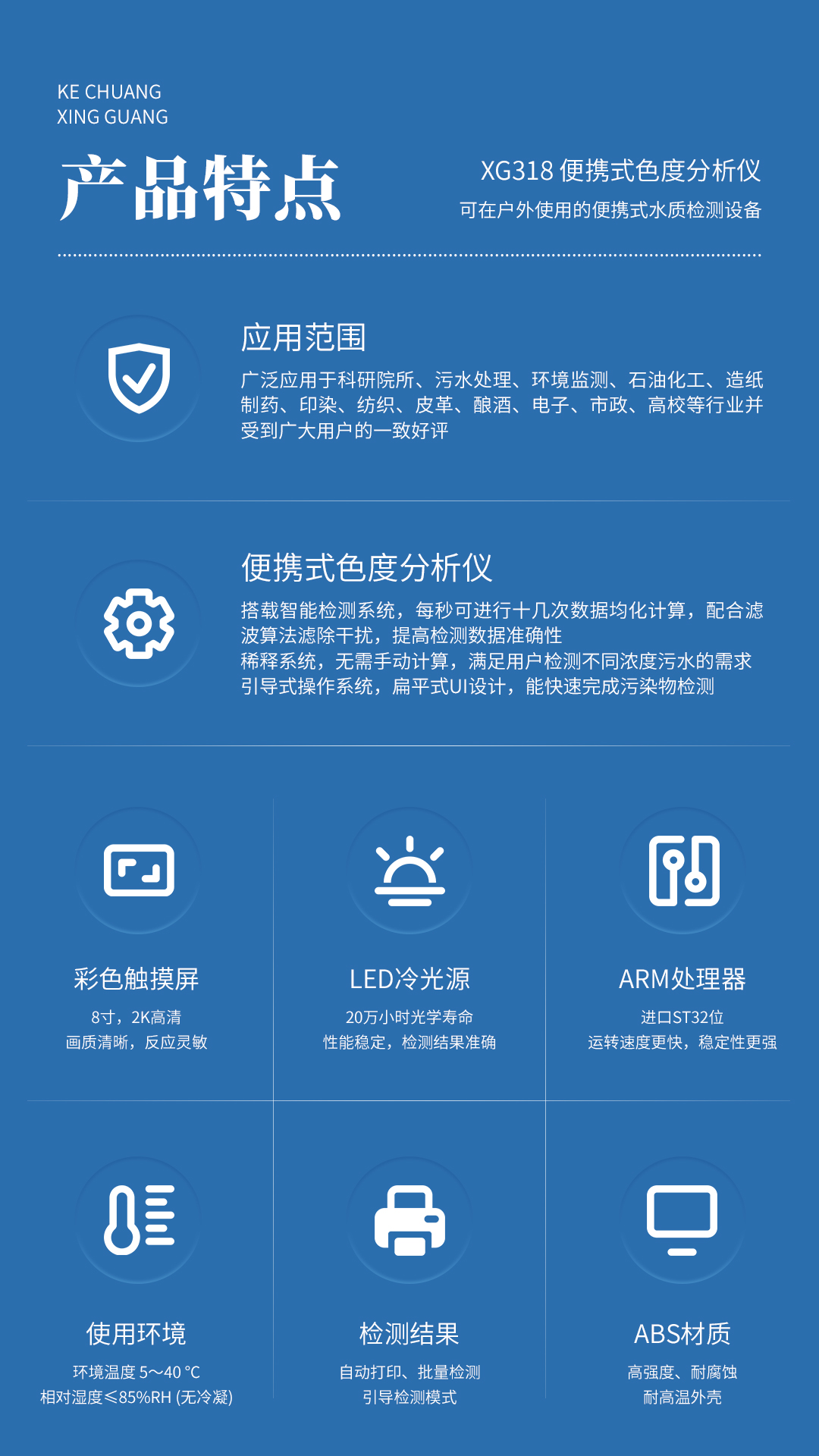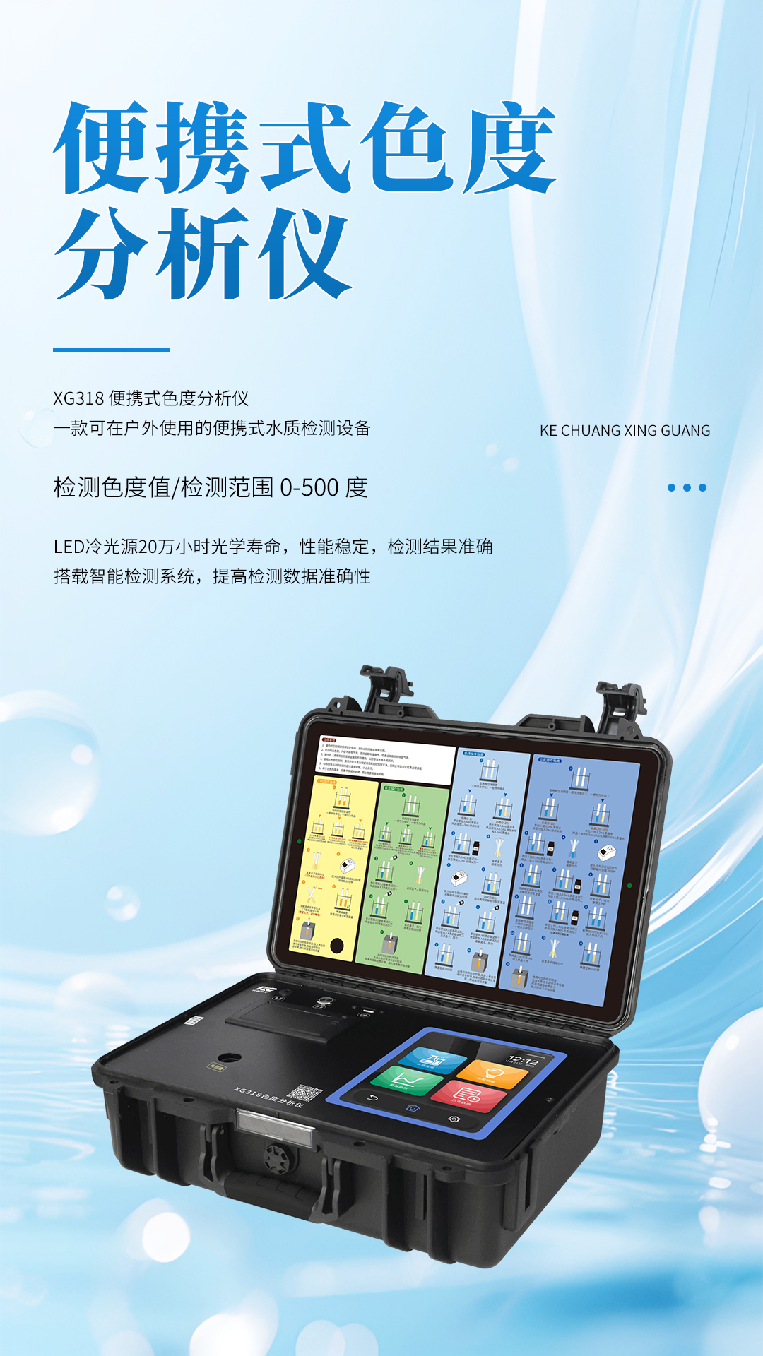 XG318 便携式色度分析仪 是⼀款可在户外使用的便携式水质检测设备,仪器采用LED冷光源和光学结构,搭载智能检测系统,每秒可进行十几次数据均化计算,采用进口ST32位ARM处理器,运转速度更快,稳定性更强。从而飞跃性的实现了水质测定仪的智能化、高性能、低噪音、稳定性强的特点。8英寸2K高清彩色触摸屏,让检测结果直观明了,产品内置水质分析、光度测量、系数曲线、样品曲线等多种应用程序。仪器广泛应用于科研院所、污水处理、环境监测、石油化工、造纸、制药、印染、纺织、皮革、酿酒、电子、市政、高校等行业并受到广大用户的一致好评。