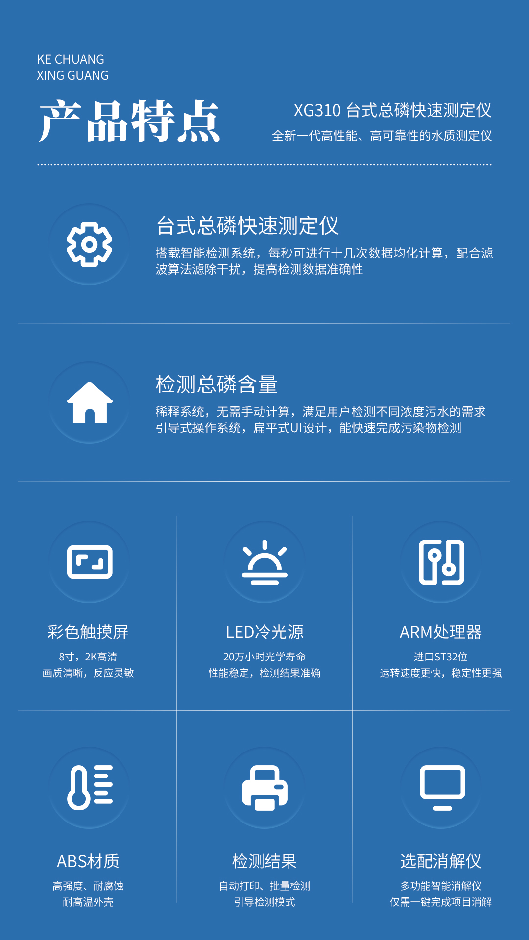 XG310 台式总磷快速测定仪 基于物联网智能化发展思路,研发的全新一代高性能、高可靠性的水质测定仪。仪器采用LED冷光源和光学结构,搭载智能检测系统,每秒可进行十几次数据均化计算,采用进口ST32位ARM处理器,运转速度更快,稳定性更强。从而飞跃性的实现了水质测定仪的智能化、高性能、低噪音、稳定性强的特点。8英寸2K高清彩色触摸屏,让检测结果直观明了,可检测总磷含量,产品内置水质分析、光度测量、系数曲线、样品曲线等多种应用程序。仪器广泛应用于科研院所、污水处理、环境监测、石油化工、造纸、制药、印染、纺织、皮革、酿酒、电子、市政、高校等行业并受到广大用户一致好评。