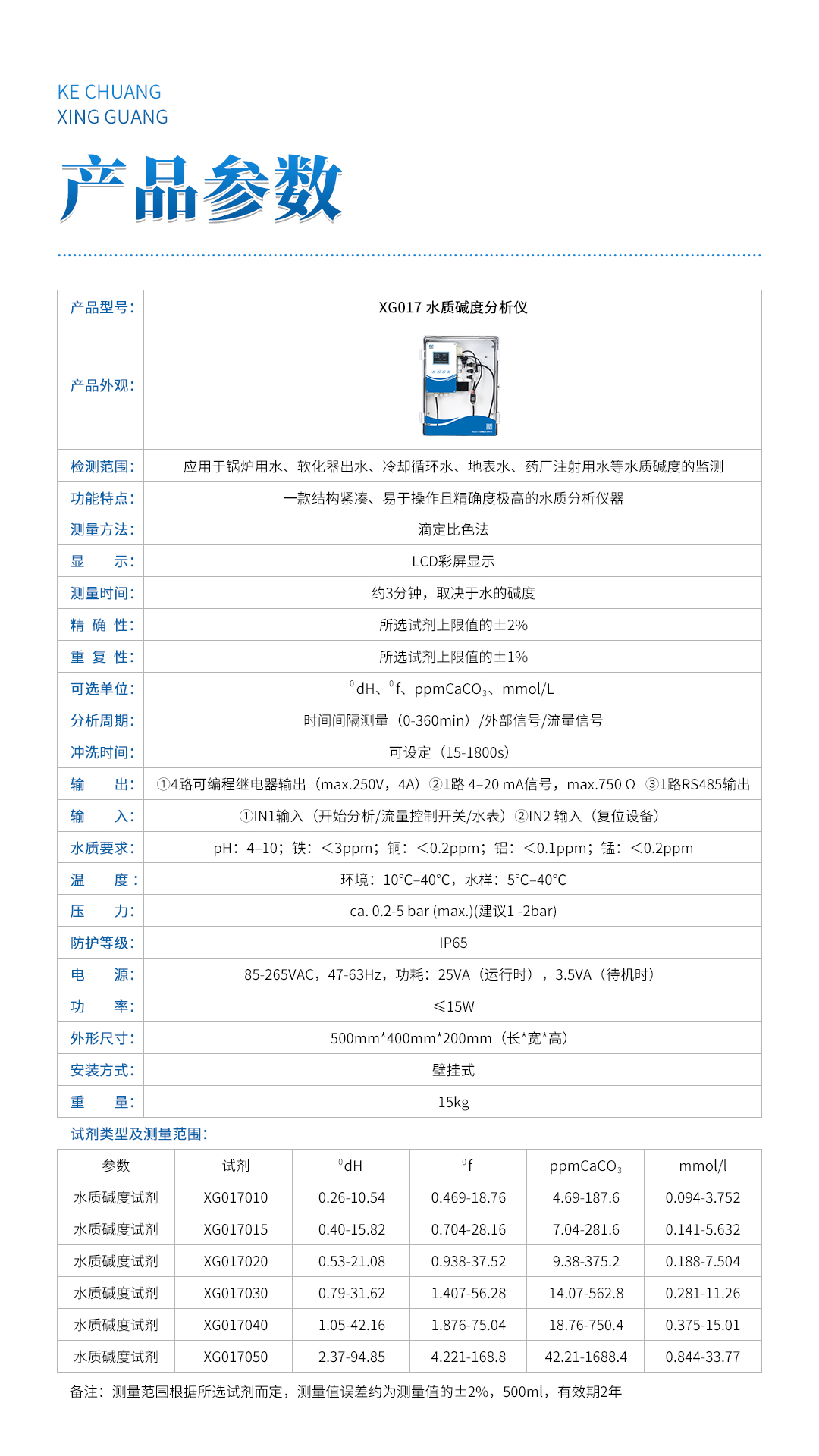 | 水质碱度试剂 | XG017030 | 0.79-31.62 | 1.407-56.28 | 14.07-562.8 | 0.281-11.26 |