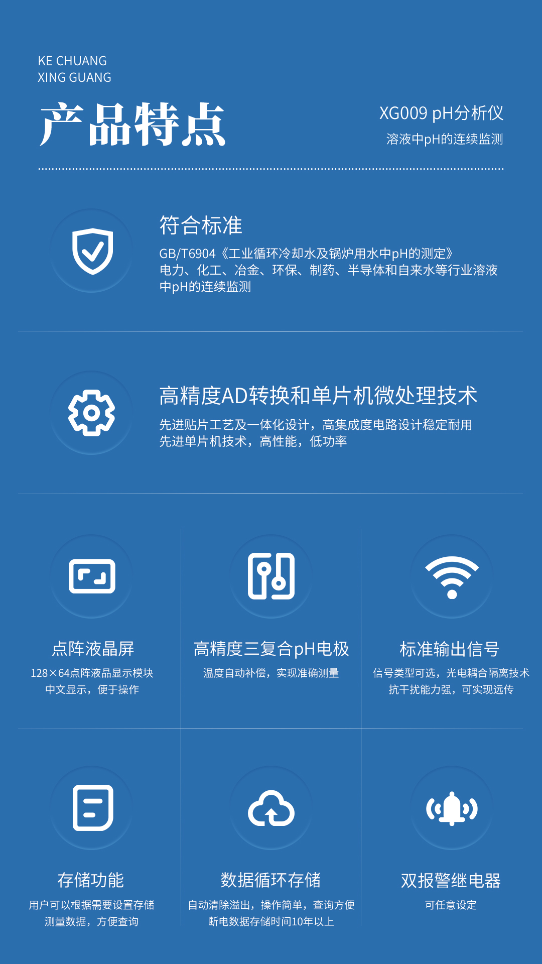 XG009型 pH分析仪 是我公司新一代高智能型水质在线pH分析仪,该仪器符合标准GB/T6904《工业循环冷却水及锅炉用水中pH的测定》,其配套的传感器采用测量电极、参比电极和温补电极结合一体的三复合pH电极,可广泛应用于电力、化工、冶金、环保、制药、半导体和自来水等行业溶液中pH的连续监测。