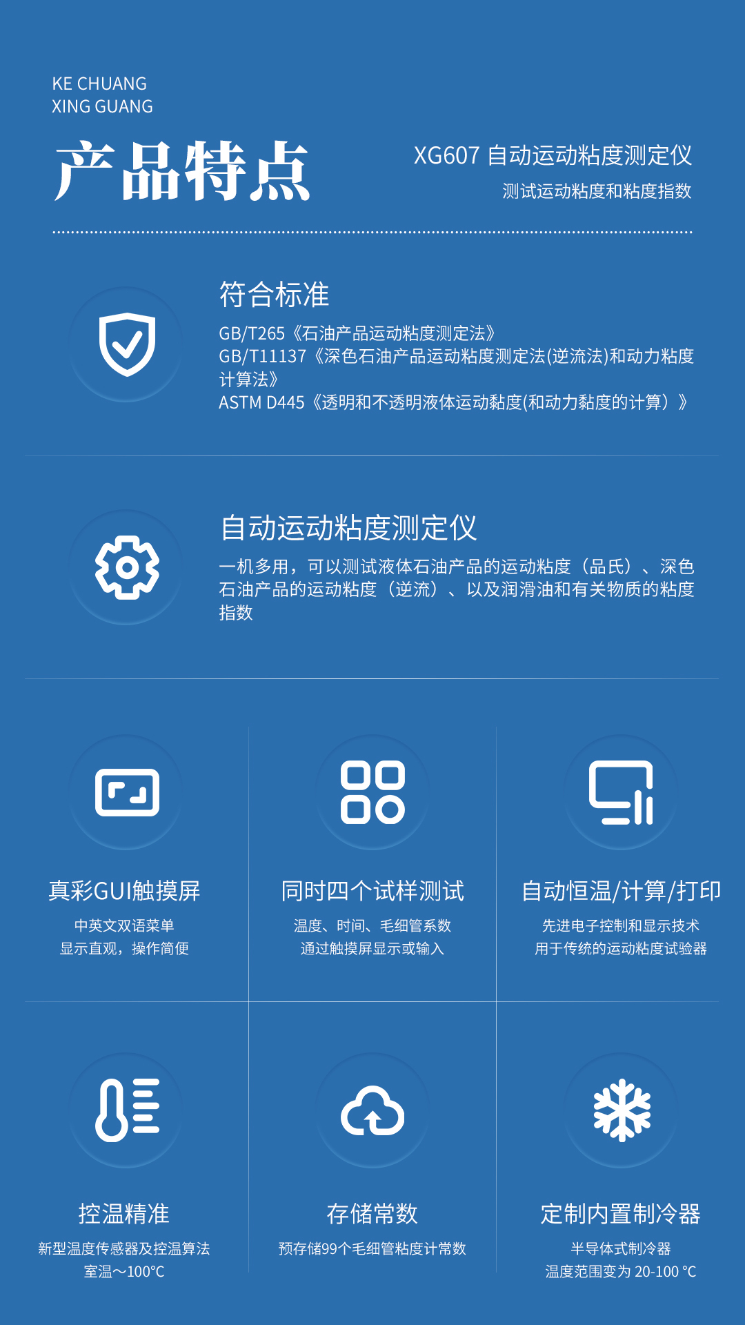 XG607自动运动粘度测定仪 依据GB/T265《石油产品运动粘度测定法》、GB/T 11137《深色石油产品运动粘度测定法(逆流法)和动力粘度计算法》、ASTM D445《透明和不透明液体运动黏度(和动力黏度的计算)》所规定的要求设计制造。可广泛应用于电力、石油化工、钢铁冶金、检测机构、科研院所、大专院校、铁路、航空、计量等部门。