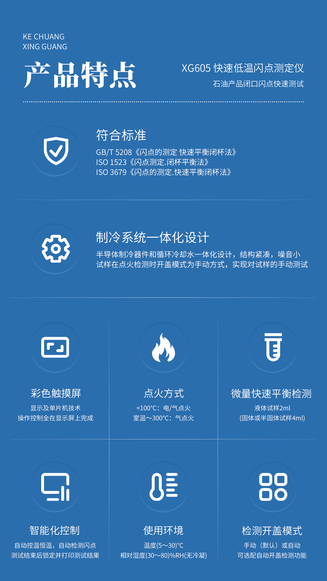 XG605 快速低温闪点测定仪 依据GB/T 5208《闪点的测定 快速平衡闭杯法》、ISO 1523《闪点测定.闭杯平衡法》和ISO 3679《闪点的测定.快速平衡闭杯法》所规定的要求设计制造。满足石油、化工、涂料、油漆、铁路、航空、电力、商检、部队、科研院校等相关单位对石油产品闭口闪点快速测试的要求。适用于闭口杯闪点在-30℃~+100℃范围内的各类色漆、油漆、胶黏剂、溶剂、石油及相关产品闭口杯闪点的测试。本仪器设计先进、结构合理、检测准确、性能稳定、显示直观、操作简单,是理想进口仪器的替代产品。