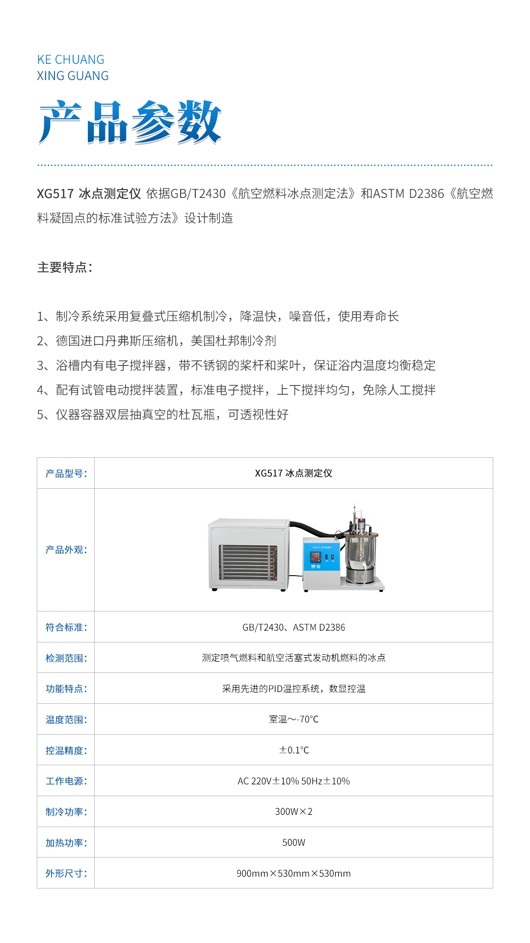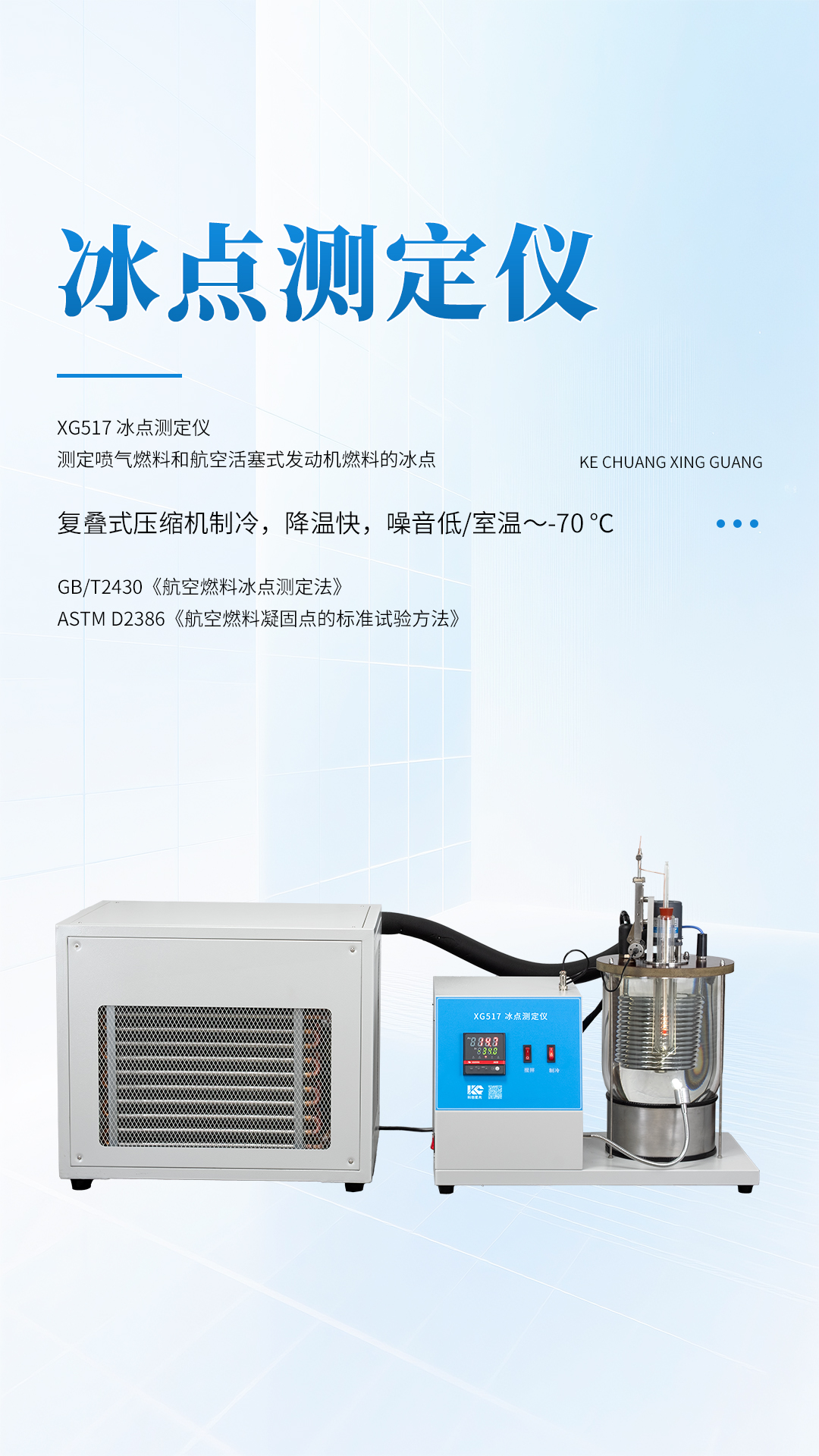 XG517 冰点测定仪 依据GB/T2430《航空燃料冰点测定法》和ASTM D2386《航空燃料凝固点的标准试验方法》所规定的要求设计制造。用于测定喷气燃料和航空活塞式发动机燃料的冰点。