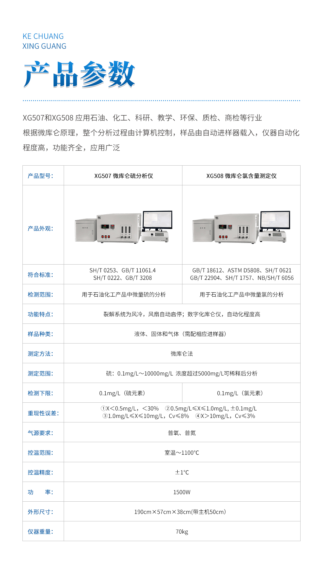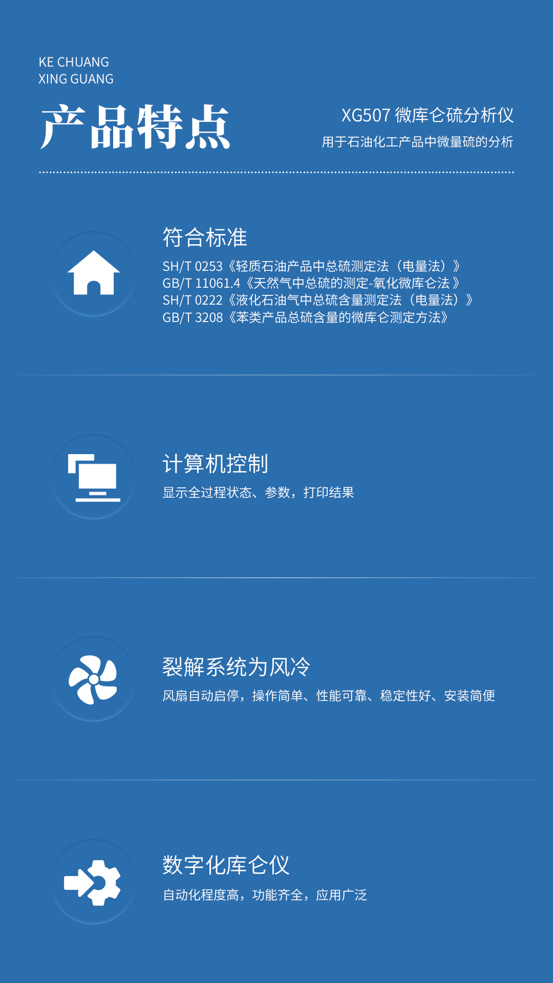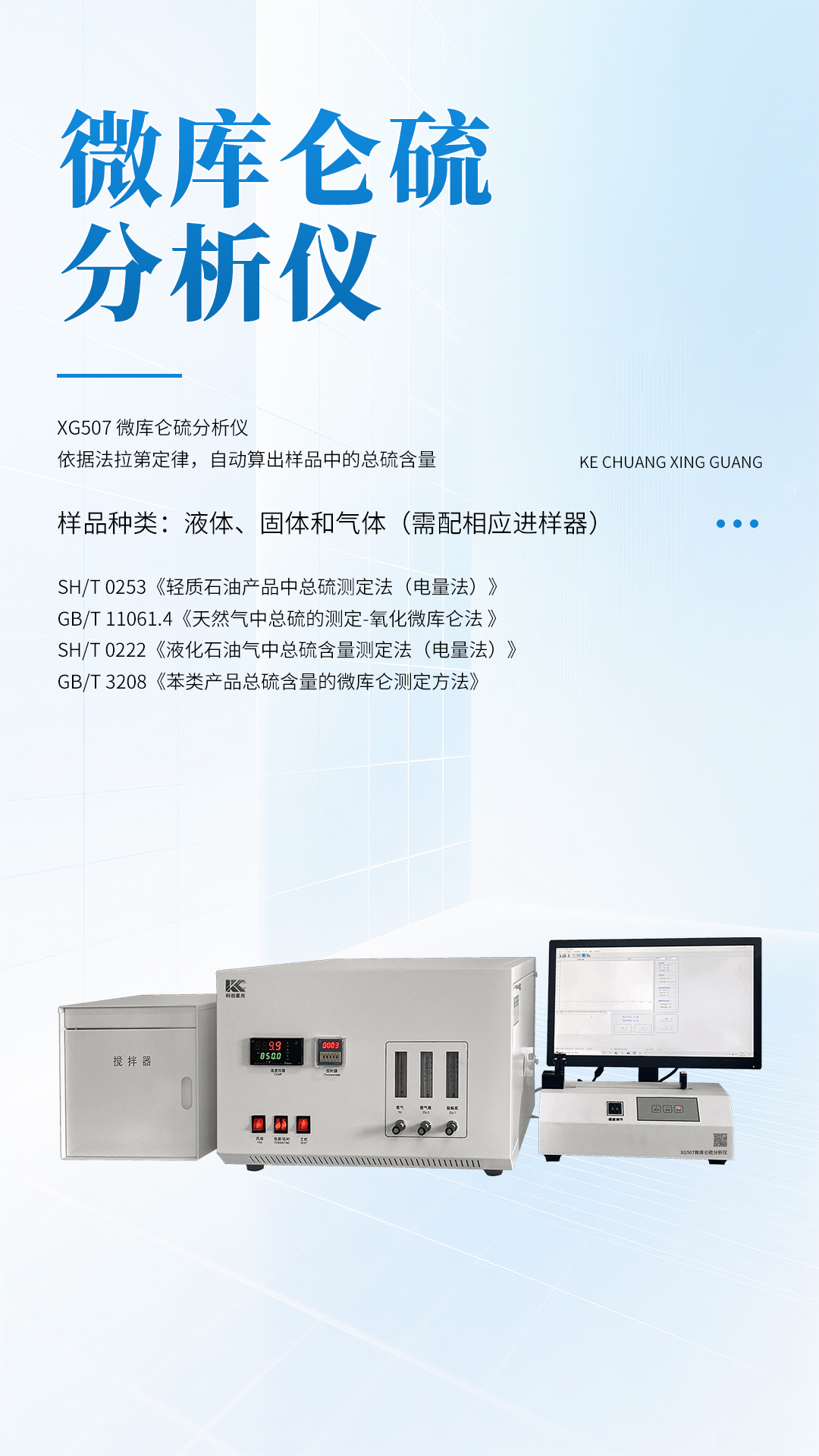 XG507微库仑硫分析仪 根据微库仑原理,样品中各种形态的硫在氮气和氧气中于高温下变成二氧化硫,进入滴定池,通过电解产生碘与二氧化硫反应,微机根据产生的碘消耗的电量,依据法拉第定律,自动算出样品中的总硫含量。整个分析过程由计算机控制,样品由自动进样器载入,仪器自动化程度高。可用于石油化工产品中微量硫的分析,广泛应用于石油、化工、科研、教学、环保、质检、商检等行业。